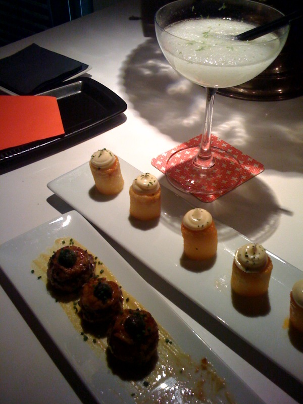 Un detalle que me encantó fue que al llegar para acompañar el aperitivo, un champagne en este caso, nos pusieron ya un par de entrantes: Té de tomates secos, nido de golondrinas y raïm de pastor (alga sobre piedras). Si la presentación es magnífica, el sabor mucho más. Después trajeron la carta y elegimos el menú degustacion Universo Local. Perdonar que las fotos no sean muy buenas, pero la luz era muy mala y es lo que salió con el iphone...